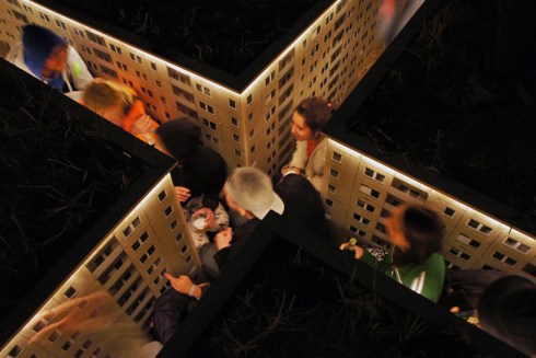 “As I came [to the site] first, that’s what I found: endless meadow, trees and blue sky. not exactly what I play with usually. so I decided to cut open the idyll, and pretend there is no endless meadow, but only rooftop-gardens of the disgust underneath”.