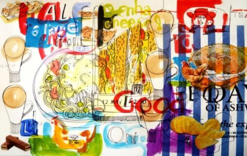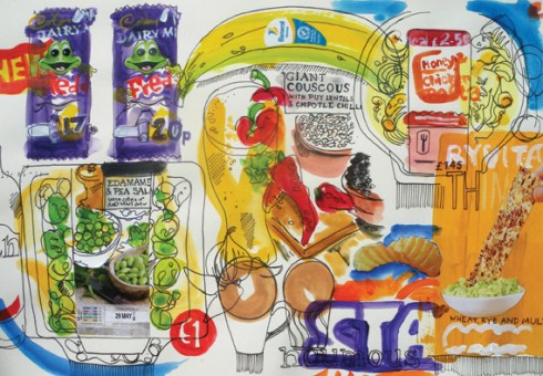 David chose to illustrate his food, using acrylic, collage, watercolour, pen and ink, sometimes in its raw form, or on the plate but often in its packaging. The result is an impressive visual diary, and the information revealed therein is strangely intimate.