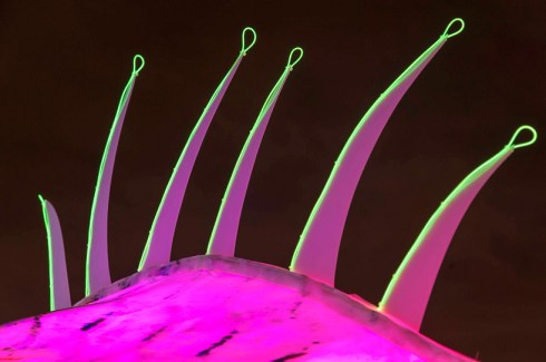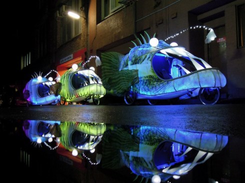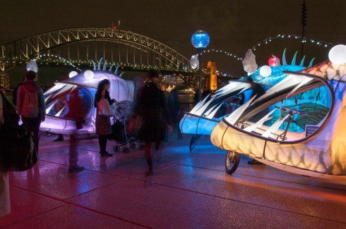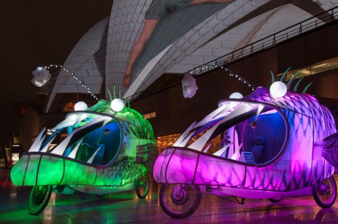During the annual VIVID sydney light event, group d collective, an australian multidisciplinary studio, built multiple illuminated ‘Angler fish’ to take part in the festival. the glowing structures are in fact bicycles that were able to be ridden around the city, creating a colorful aquatic spectacle to adorn the grey urban landscape. The three deep-sea creatures were fabricated with custom frames that then had digitally-printed lycra and chiffon skins pulled tightly over. The radiant purple, blue and green tones coordinated well with the theme of the vibrant carnival, bringing a marine glow to its audience.