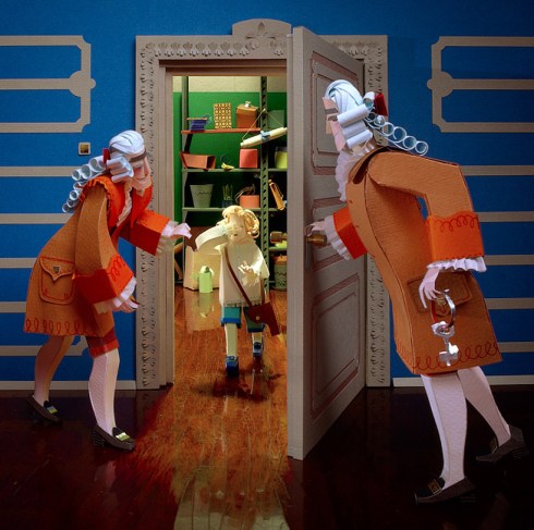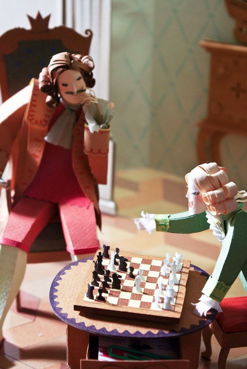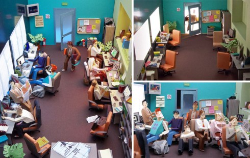 Using a range of knives, scissors, tweezers, and other tools on wire and a combination of construction and specialty papers, the team creates not only miniature furniture and figures but also entire sets for the pieces. their ‘star’ series represents famous musicians, from michael jackson to queen to elton john; ‘tsar peter and tsarevitch alexey’ depicts the happier early days of the famous russian rulers; and their ‘office’ and ‘factory’ series recreate scenes from the everyday working world.