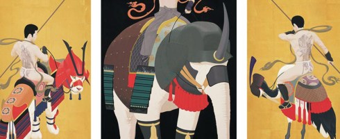 Many of the works sample from traditional aesthetics: a large triptych by hisashi tenmyouya treats the subject of battle in imagery characteristic of traditional depictions, but illustrates the feral brutality of war rather than the expected lofty religious imagery. likewise, yamaguchi akira’s ‘Narita international airport’ adopts the perspective of seventeenth century illustrations of kyoto, but with airplanes circling the skies and the classic misty clouds cast in a yellow suggestive of pollution. Other works include the debut of Kohei Nawa’s ‘pixcell-deer #24’, a taxidermized deer whose skin has been covered with different sized plastic beads; large-scale paperwork installations by Tomoko Shioyasu and Haruka Kojin; and Chiharu Shiota’s ‘dialogue with absence’, which links a painted wedding dress, pumps, tubing, and red-dyed water.