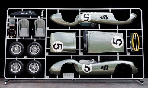 Arriving on a parts tree that measures 6.35m x 3.30m, a hand made 1:1 scale model of the 1959 Aston Martin DBR1 le mans winning car is produced by Evanta Motor Company based in hertfordshire, england. Built using a replica of an injection molded sprue for model parts, each component is individually labeled and placed within the container, as if you could twist it off for assembly. used within the collection is an entire DBR1 body finished in an original aston martin californian sage green lemans color-way, a full set of four 16″ wire wheels outfitted in dunlop racing tires and a 15 inch ‘mota lita’ wood trimmed wheel. also included in the kit is a pair of replica aston martin racing seats using the correct leather and weave, a machined aluminum gear knob and lever, and a full dashboard finished in textured satin black and assembled using smiths gauges and period switches.
