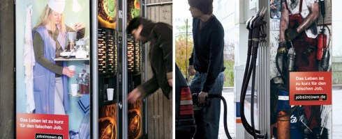 One of the print ads for jobsintown’s ‘life is too short for the wrong job’ campaign a new video commercial released by German employment website “jobsintown” joins the company’s playful visual representations of their slogan ‘life is too short for the wrong job’. The company’s four-year print ad campaign, designed by scholz & friends berlin, feature human workers powering everyday machines: a hardworking woman lives within every laundromat machine, scrubbing at your clothes, and an Elvis impersonator spends his workday in each jukebox you encounter. Taking a different approach to the same slogan, the video commercial was created by grabarz & partner and depicts a fisherman whose true calling lies outside of his current profession.