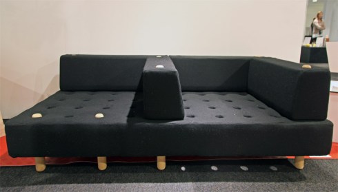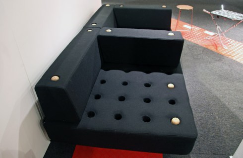 ‘Holey poley’, a modular daybed concept designed by australian-born, copenhagen-based furniture design student clinton stewart, is composed solely of wooden poles and interchangeable cushions, adaptable to a range of seating configurations. A primary wool mattress is gridded with a series of holes, into which short and long poles are inserted to function as legs for the unit. Atop the the longer poles, users can place one of a series of cushion models to create armrests or seating divisions.