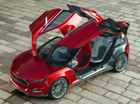 The EVOS concept car introduces a new design direction for the global car manufacturer ford. debuting at the 2011 frankfurt motor show, the vehicle is an interpretation of a fastback bodystyle design, featuring four gull-wing doors which open to reveal a four-seat layout. The concept offers a bold red driver’s seat and the vision of unprecedented driver interface. the two rear seat passengers host dedicated touch-screen displays to interact with the vehicle and individually adjustable sports seats.